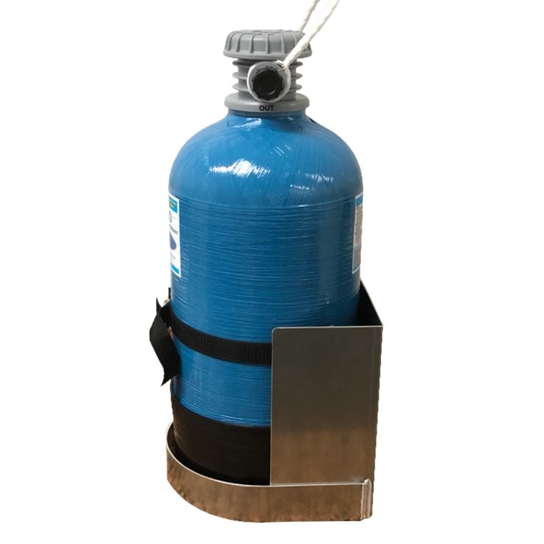 This aluminum bracket fits all our 9" X 18" softener and deionizer tanks. It comes with mounting screws and nylon strap to secure the unit in the bracket.